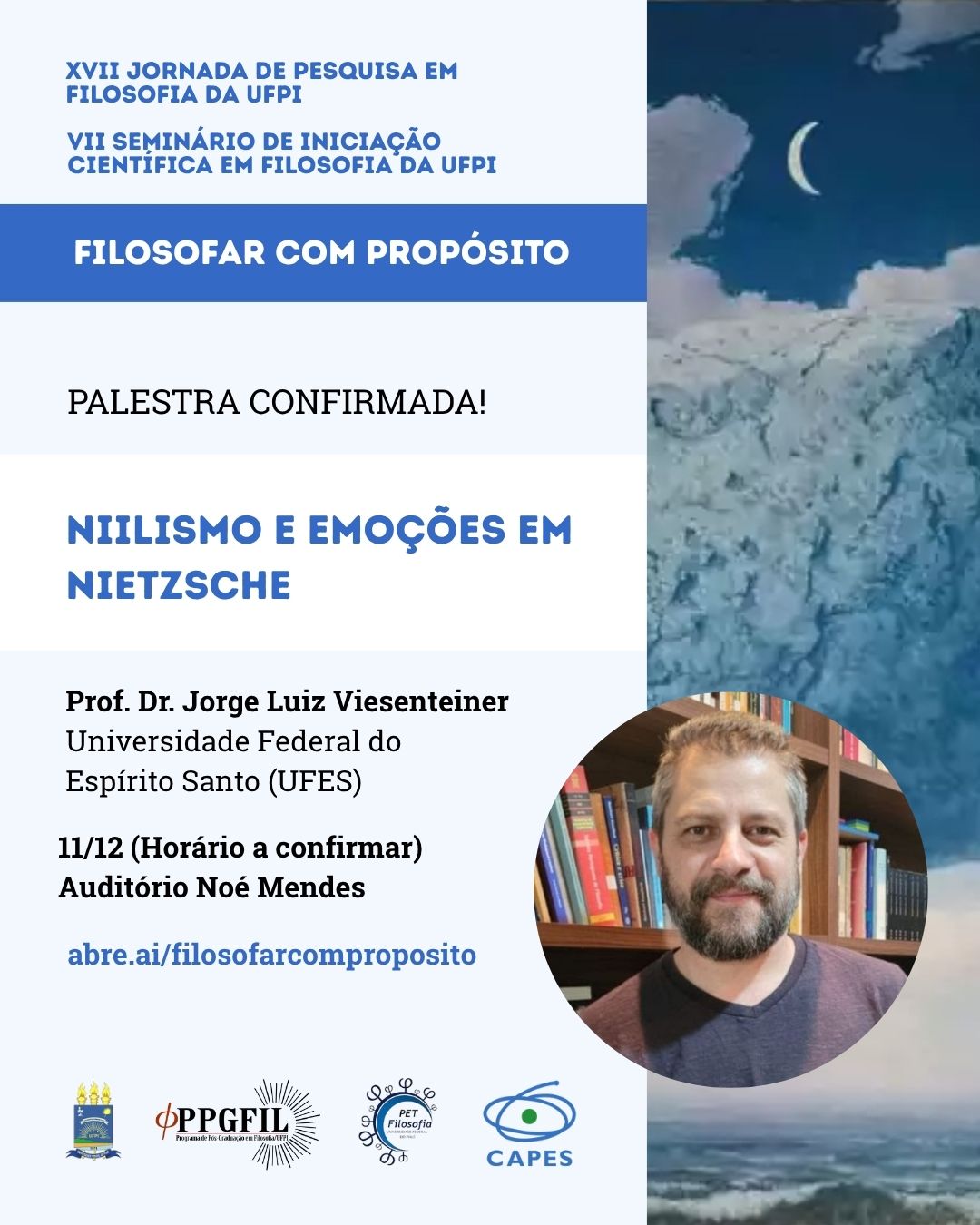 No dia 11/12/2025, receberemos o Prof. Dr. Jorge Viesenteiner (UFES) com a palestra “Niilismo e emoções em Nietzsche”, atividade de encerramento da XVII Jornada de Pesquisa em Filosofia da UFPI e VII Seminário de Iniciação Científica em Filosofia da UFPI.