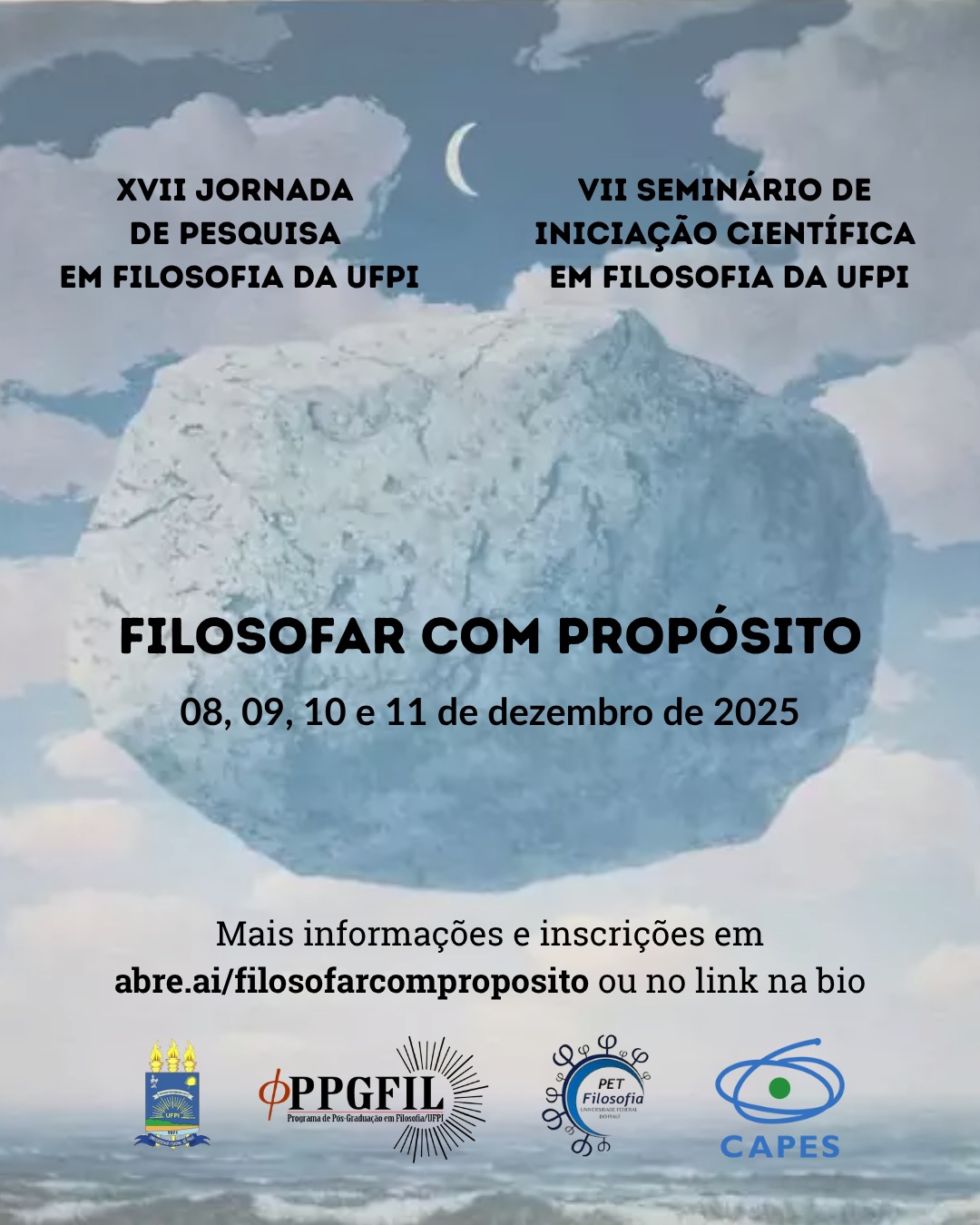 O PPGFIL – UFPI vem a público convidar a comunidade acadêmica para participar da XVII Jornada de Pesquisa em Filosofia da UFPI e VII Seminário de Iniciação Científica em Filosofia da UFPI, com o tema: Filosofar com propósito. O evento ocorrerá entre os dias 08 e 11 de dezembro, com apresentações a partir do dia 09/12/2025. As inscrições de trabalhos estarão abertas até o dia 23/11/2025, através de formulário no nosso site. As inscrições para ouvintes estarão abertas até o início do evento. O evento é presencial e a programação oficial será divulgada em breve no site oficial do evento.